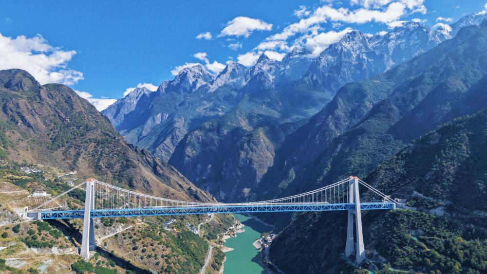 这是11月21日拍摄的虎跳峡金沙江铁路大桥。大桥全长882.5米,起于玉龙雪山隧道出口,止于哈巴雪山隧道入口。这是澧湘铁路重大控制工程(无人机照片)。